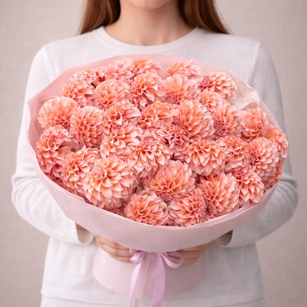 Букет георгинов «Пудровое облако» — это воплощение нежности, воздушности и утончённой романтики. Пышные пудрово-розовые георгины создают ощущение лёгкости и мягкого тепла, словно невесомое облако на закате. Лаконичное оформление в пастельных тонах подчёркивает естественную красоту цветов и делает композицию особенно изящной.