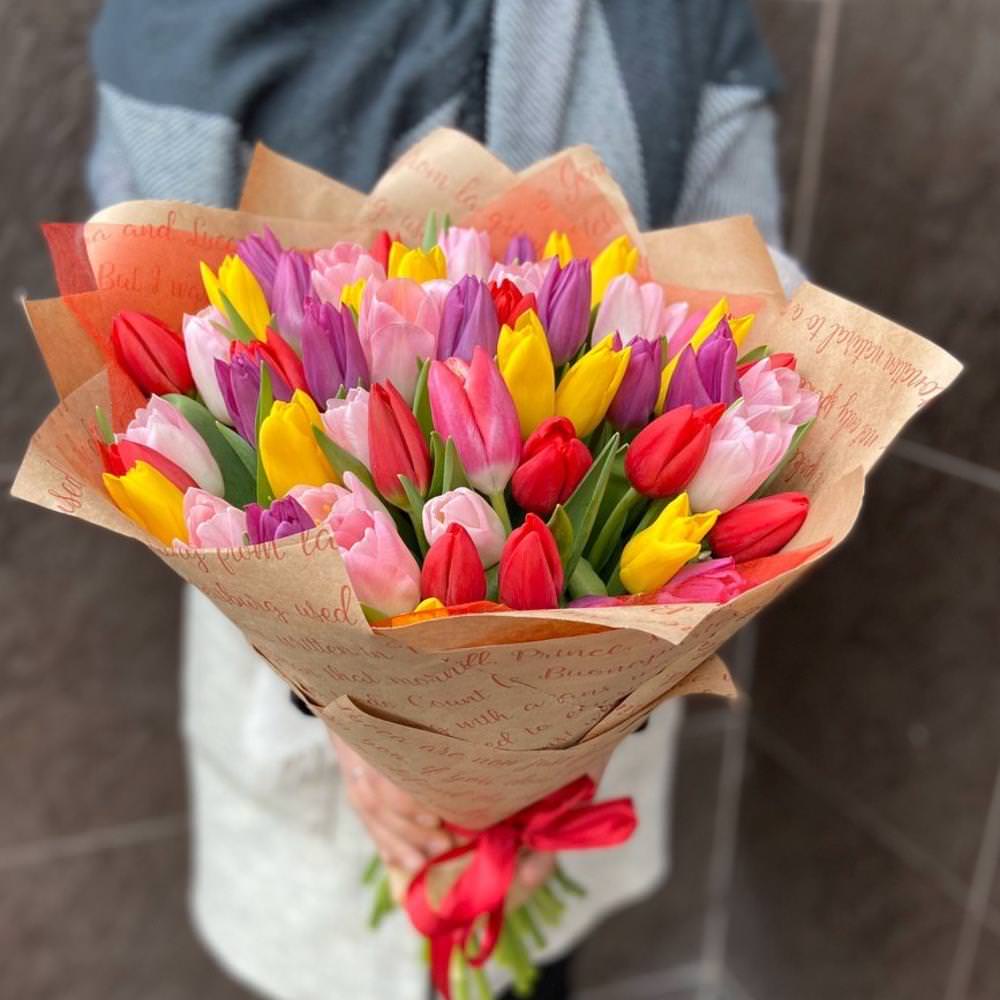 Тюльпан микс 51 штука - букет, который производит яркое впечатление благодаря гармоничному сочетанию стиля и упаковки