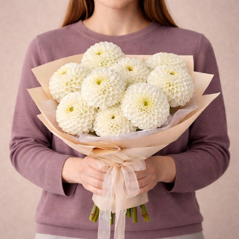 Букет «Чистая элегантность» — утончённая композиция, в которой белоснежные георгины раскрываются во всей своей благородной красоте. Их аккуратные, идеально симметричные соцветия создают ощущение гармонии, лёгкости и безупречного вкуса. Нежные оттенки подчёркивают изящество букета, делая его универсальным подарком для самых искренних и тёплых моментов.