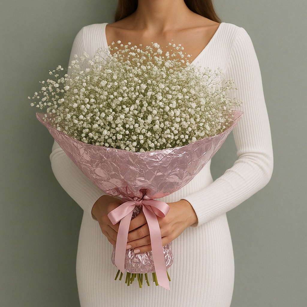Лёгкий и изысканный букет из гипсофилы в нежной розовой упаковке создаёт атмосферу утончённой элегантности. Белые воздушные соцветия словно облачко нежности, которое станет символом искренних чувств и очарования. Идеален как для романтического подарка, так и для стильного дополнения к любому событию.