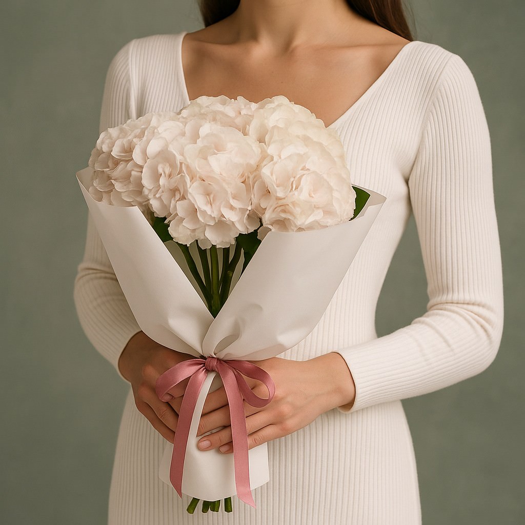 Изысканный букет из бело-розовых гортензий, словно облако нежности и воздушности. Его мягкие пастельные оттенки создают атмосферу спокойствия и утончённости. Такой букет станет идеальным подарком для выражения искренних чувств, благодарности или романтического внимания.