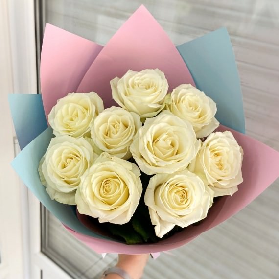 Букет из 9 белых роз - букет, который прекрасно демонстрирует баланс между упаковкой, стилем и свежестью бутонов