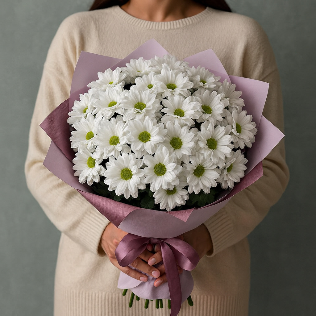 Лёгкий и элегантный букет из белых хризантем с нежным лиловым оформлением —