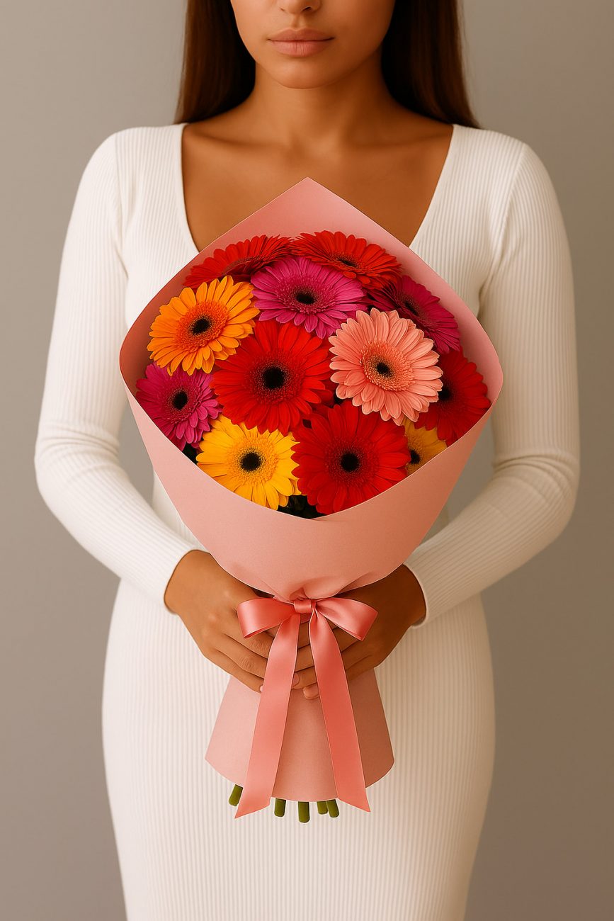 Энергичный и жизнерадостный букет из разноцветных гербер наполняет атмосферу теплом и позитивом. Он станет отличным подарком, чтобы выразить радость, признательность или просто подарить хорошее настроение. Яркая палитра оттенков делает композицию универсальной для любого праздника.