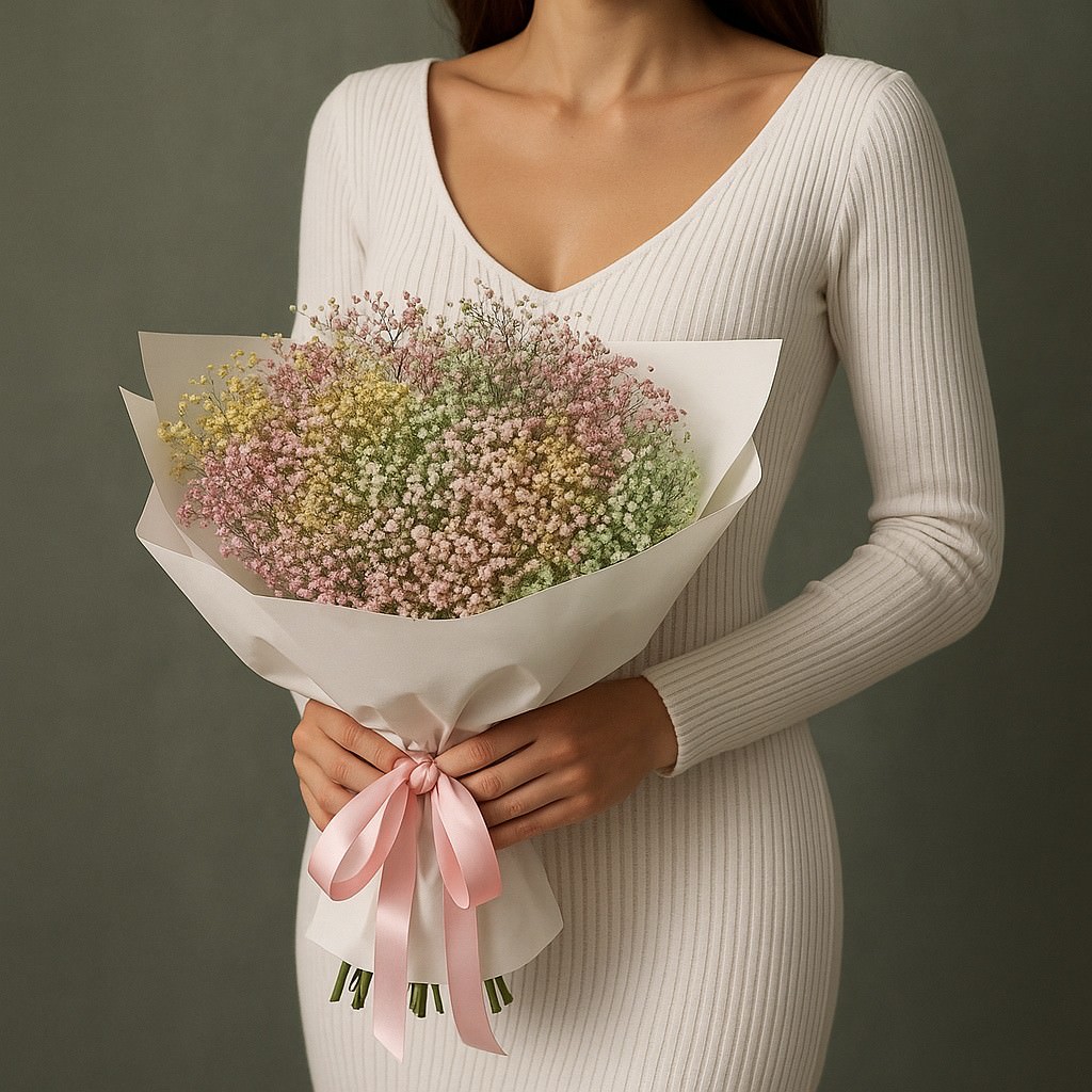Нежный и воздушный букет из разноцветной гипсофилы, словно облако из ярких оттенков, дарит настроение радости и лёгкости. Его пастельные переливы создают атмосферу праздника и идеально подойдут для самых трогательных моментов.