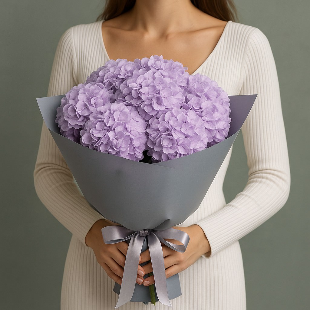 Изысканный и воздушный букет из нежных сиреневых гортензий, собранных в стильную упаковку. Его утончённые оттенки и объёмная форма создают ощущение лёгкости и гармонии. Такой букет станет прекрасным подарком для выражения нежности и романтики.