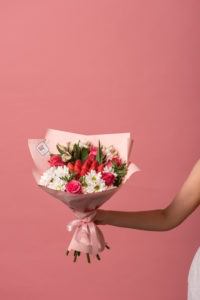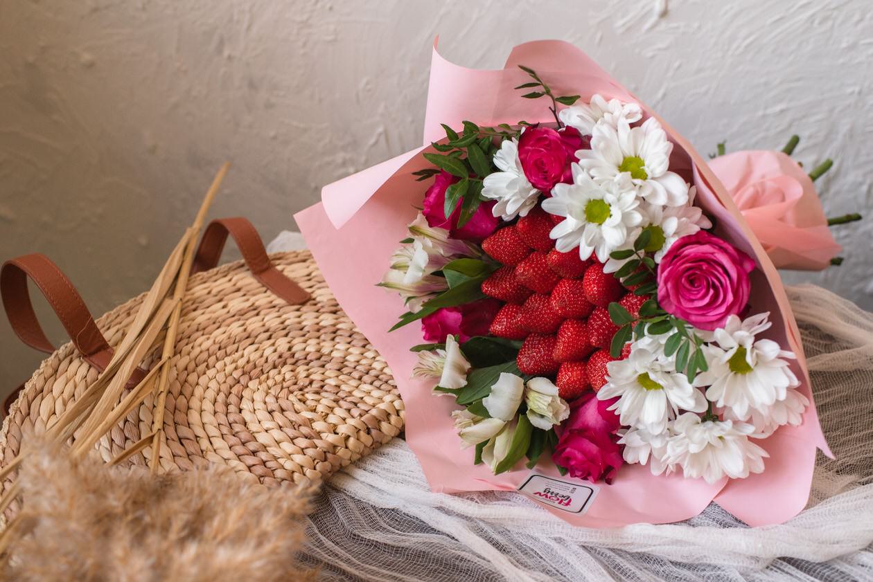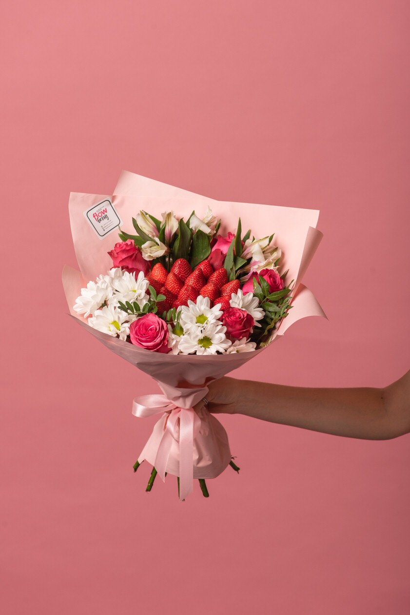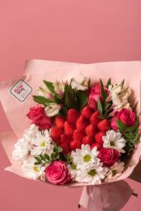 Летний, насыщенно-яркий букет из спелой клубники и микса цветов