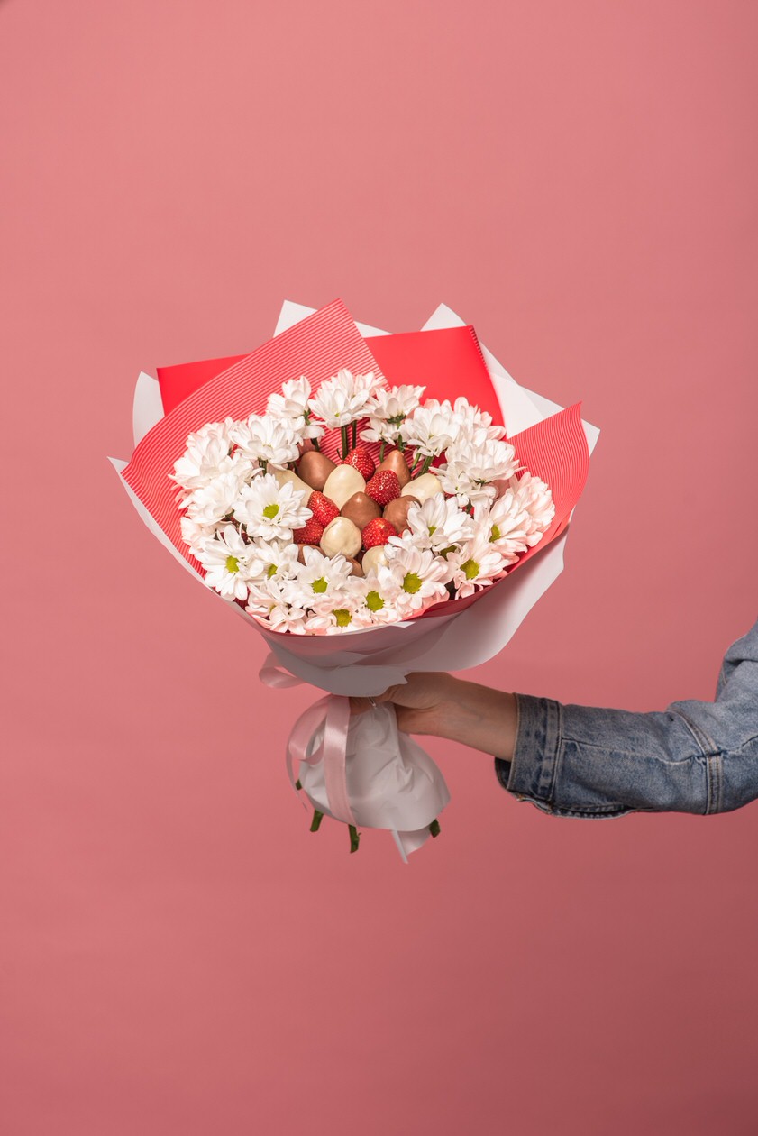 Букет из клубники «Летний» - букет, который привлекает внимание своим уникальным оформлением и необычным цветовым решением