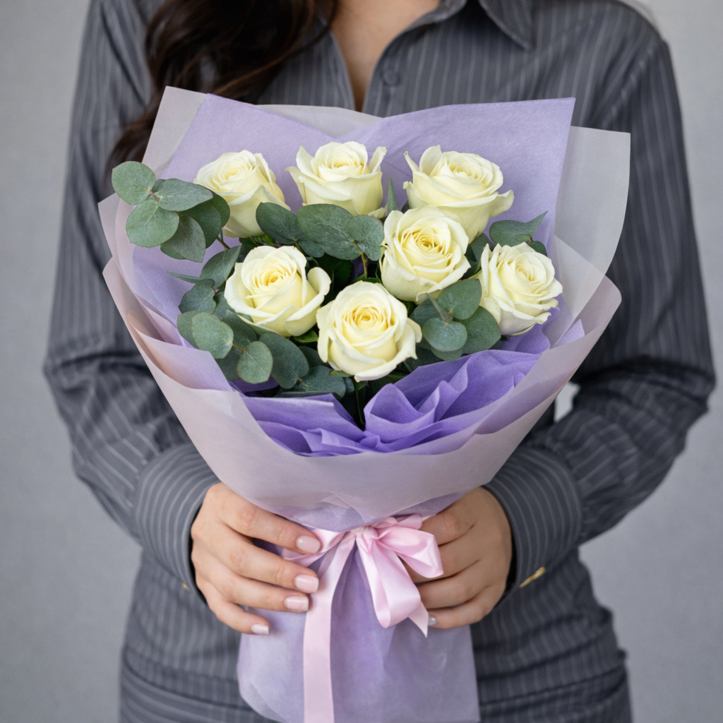 Изысканный букет из семи нежных белых роз — это символ чистоты, искренности и утончённой элегантности. Лаконичный и воздушный, он наполняет пространство светом и спокойствием, подчёркивая особое отношение к получателю. Такая композиция идеально подойдёт для признания, знака внимания, поздравления или тёплого жеста без лишних слов.
