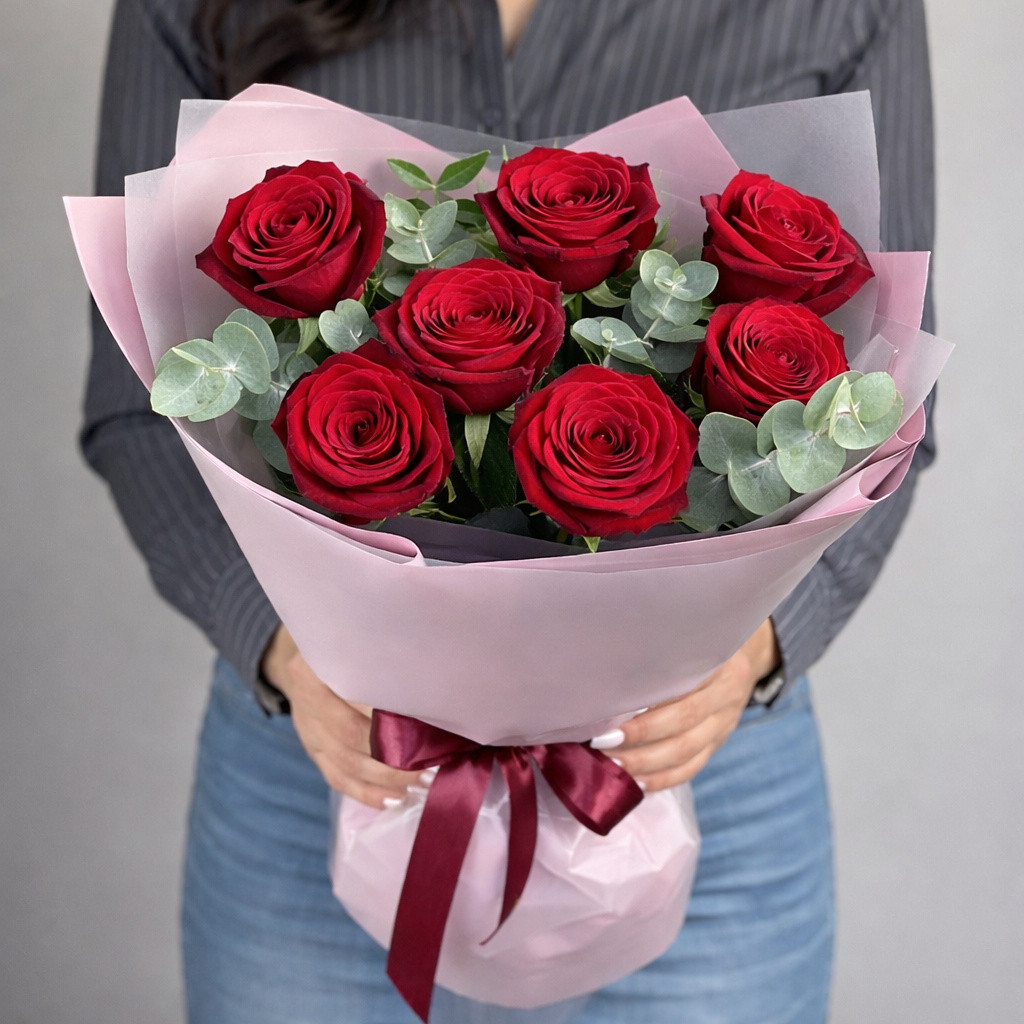 Изысканный букет из семи красных роз — это символ глубоких чувств, страсти и искреннего восхищения. Бархатные алые бутоны создают атмосферу тепла и романтики, наполняя пространство выразительной красотой. Элегантная упаковка и атласная лента подчёркивают торжественность композиции, делая букет идеальным подарком для признания в любви, важного поздравления или яркого знака внимания.