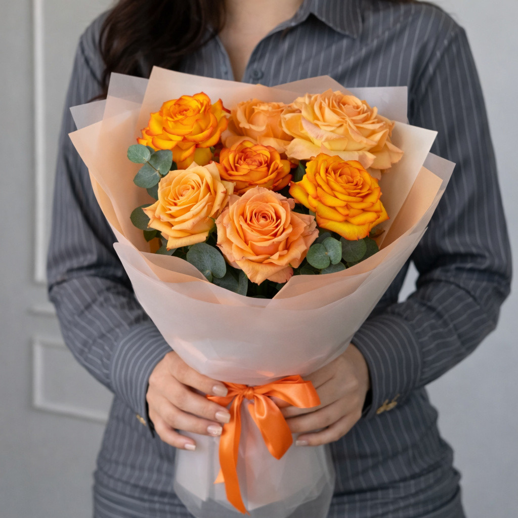 Изысканный букет из семи нежных роз — это сочетание утончённой элегантности и тёплой искренности. Мягкие светлые оттенки бутонов наполняют композицию ощущением света, спокойствия и гармонии, подчёркивая особое отношение к получателю. Воздушная упаковка и аккуратная атласная лента делают букет изящным и универсальным подарком для признания, поздравления или душевного жеста без лишних слов.