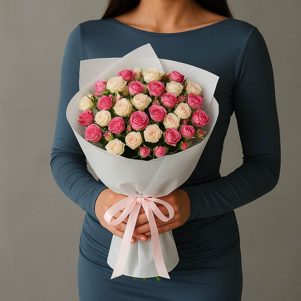 Нежный букет кустовых роз в розово-белых оттенках — символ чистоты и утончённых чувств. Его мягкая цветовая палитра и элегантное оформление делают композицию универсальным подарком для самых трогательных событий. Такой букет создаст атмосферу тепла и оставит яркое впечатление.