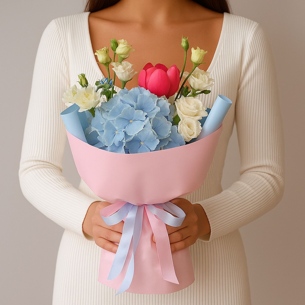 Очаровательный букет в светло-розовой упаковке с атласными лентами, в котором нежность голубой гортензии, свежесть кремовой эустомы и акцент яркого розового тюльпана создают гармоничное сочетание. Композиция наполнена лёгкостью и романтичным настроением, словно лёгкие облака на весеннем небе.