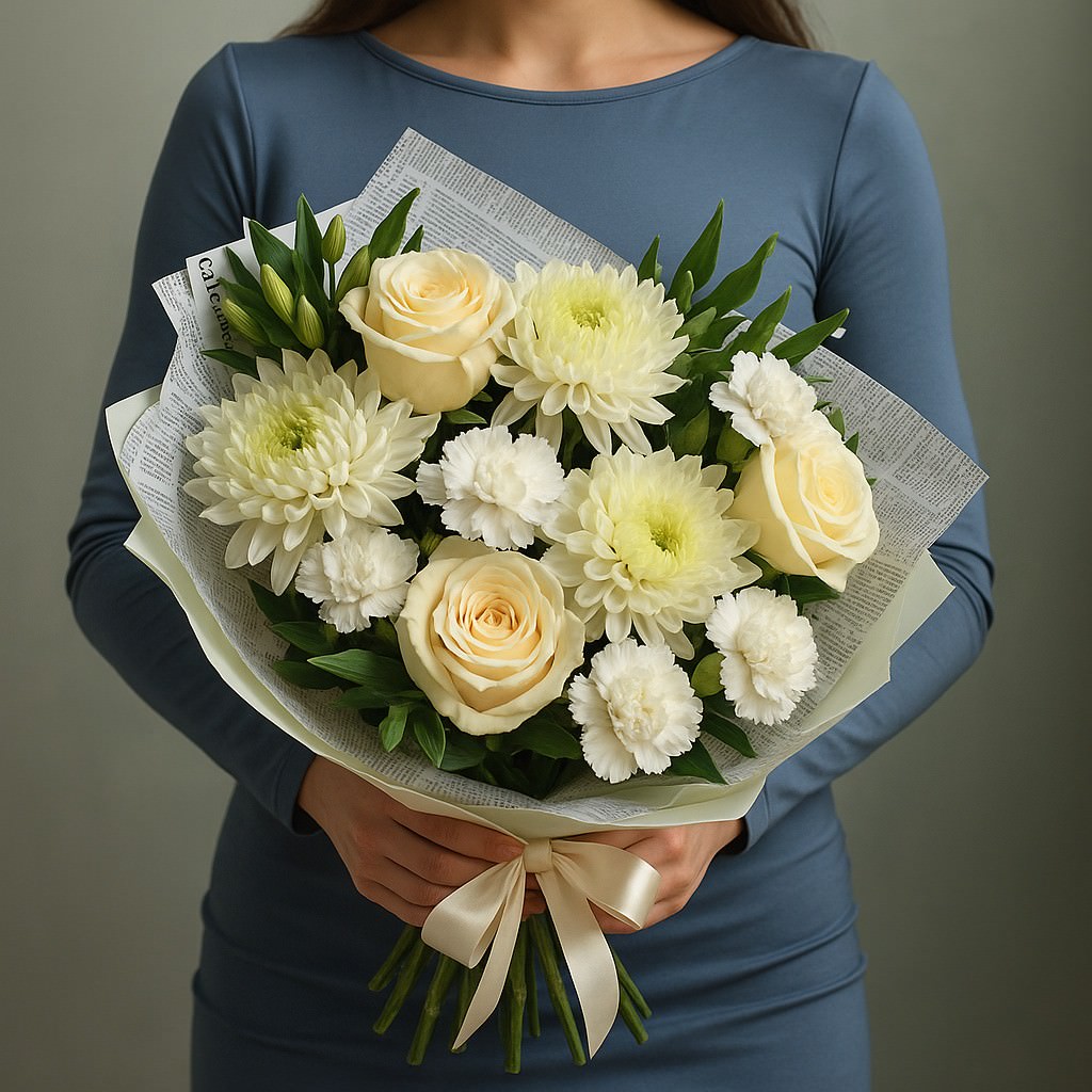 Букет «Нежность в кремовых тонах» — изысканная композиция для самых тёплых эмоций. Сочетание айвори-роз и пышных хризантем создаёт атмосферу уюта, чистоты и искренности. Такой букет станет идеальным подарком для дня рождения, юбилея, свадьбы или благодарности, подчёркивая ваши самые светлые чувства.
