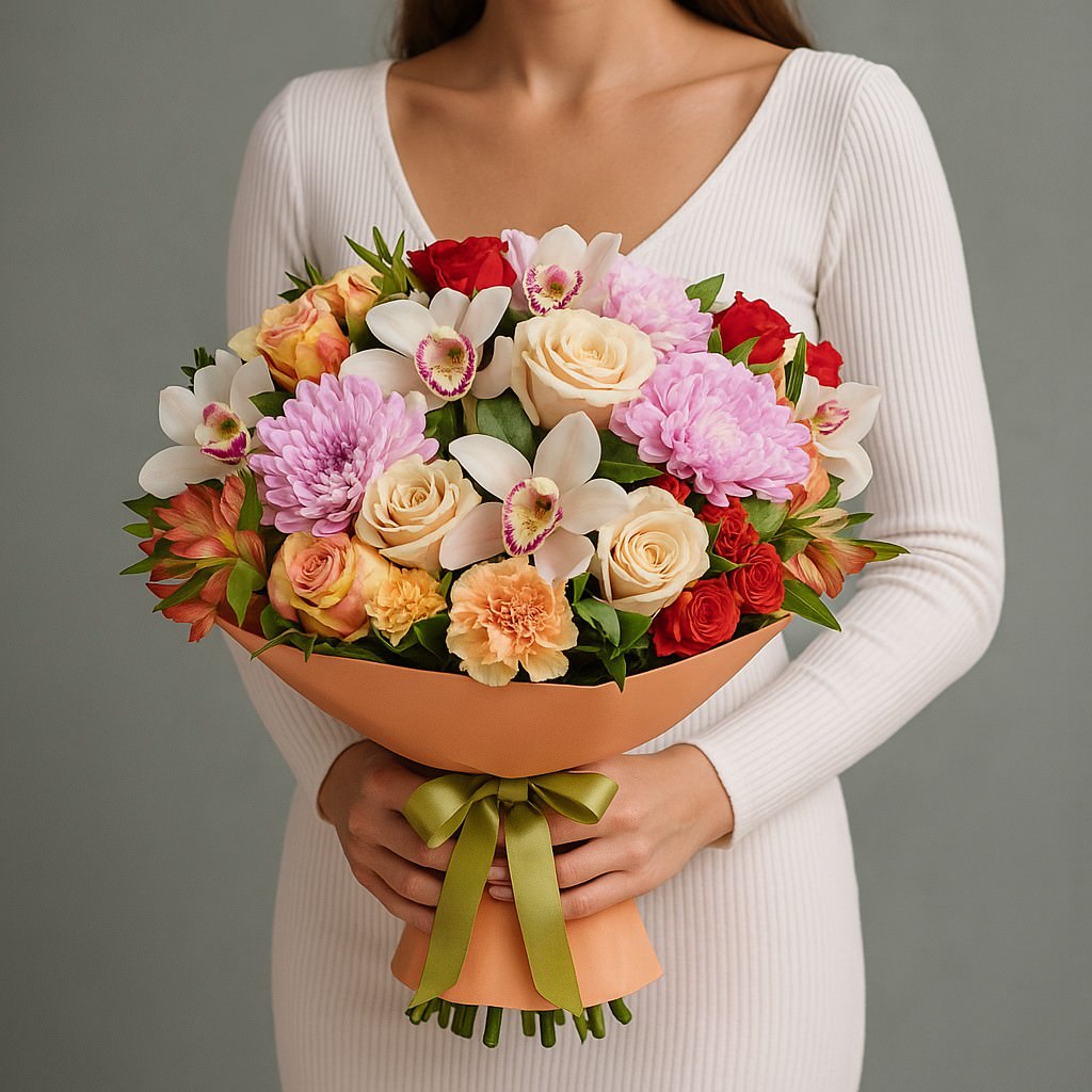 Букет «Очарование нежности» — гармоничное сочетание нежных оттенков и утончённых форм. Лёгкие орхидеи, розы, хризантемы и гвоздики создают изысканную композицию, наполненную мягкостью, теплом и романтикой. Такой букет станет идеальным подарком, чтобы выразить искренние чувства и заботу.