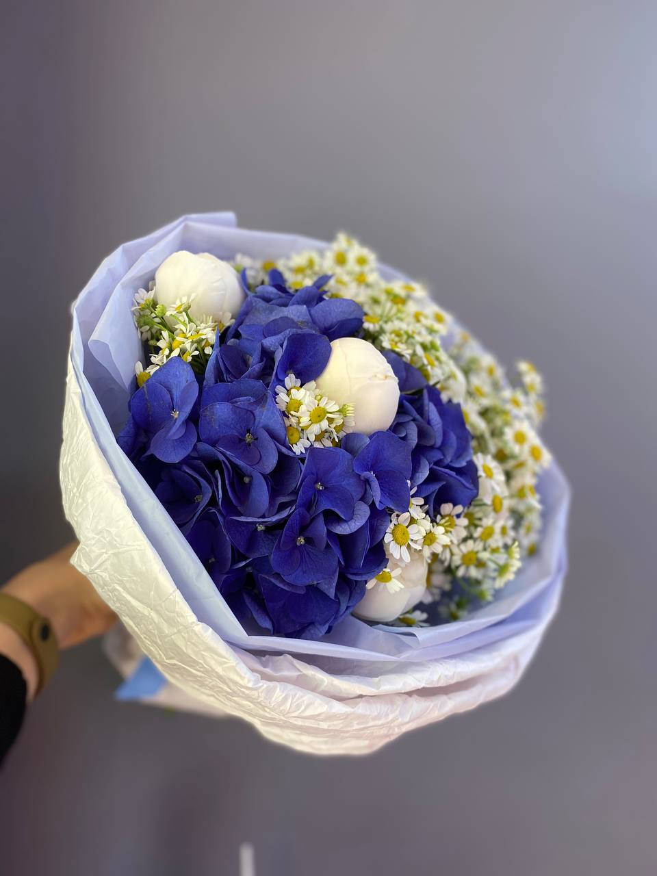 Такой изысканный букет станет отличным подарком на юбилей, свадьбу и любое другое торжество и обязательно произведет огромное впечатление. Композиция построена на контрасте плотных белоснежных пионов, хрупкой красоты желто-белых лепестков ромашек и яркости гортензии.