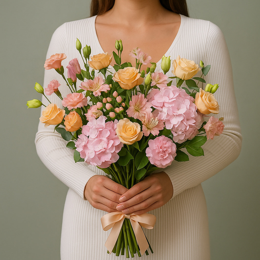 Нежная композиция в пастельных оттенках с гортензией, розами и альстромерией. Букет создан, чтобы дарить тепло, лёгкость и радость, он станет прекрасным подарком для самых трогательных моментов.