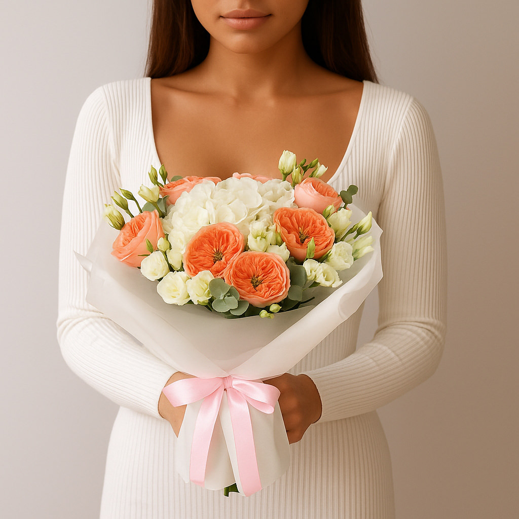 Изысканная композиция, наполненная нежностью и свежестью. Теплые персиковые розы в сочетании с белыми гортензиями и эустомами создают гармонию утонченности и легкости. Такой букет станет прекрасным подарком, подчеркивающим искренние чувства и внимание.
