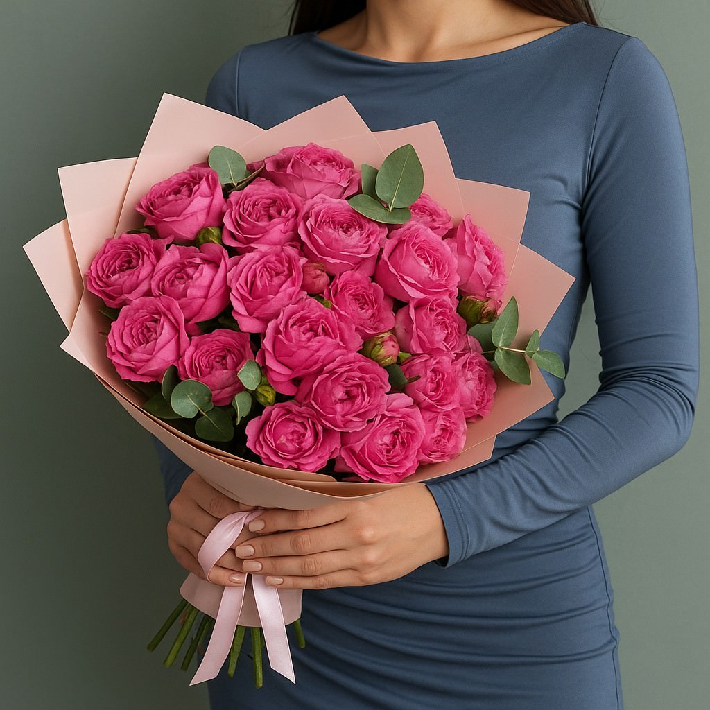 Элегантный букет из пионовидных роз в нежных розовых оттенках — символ утончённости, искренности и душевного тепла. Такая композиция прекрасно подойдёт для признания в чувствах, поздравления с важным событием или как изысканный подарок, который подчеркнёт внимание и заботу. Благодаря своему нежному оформлению букет гармонично впишется в любой праздник и оставит самые тёплые впечатления.
