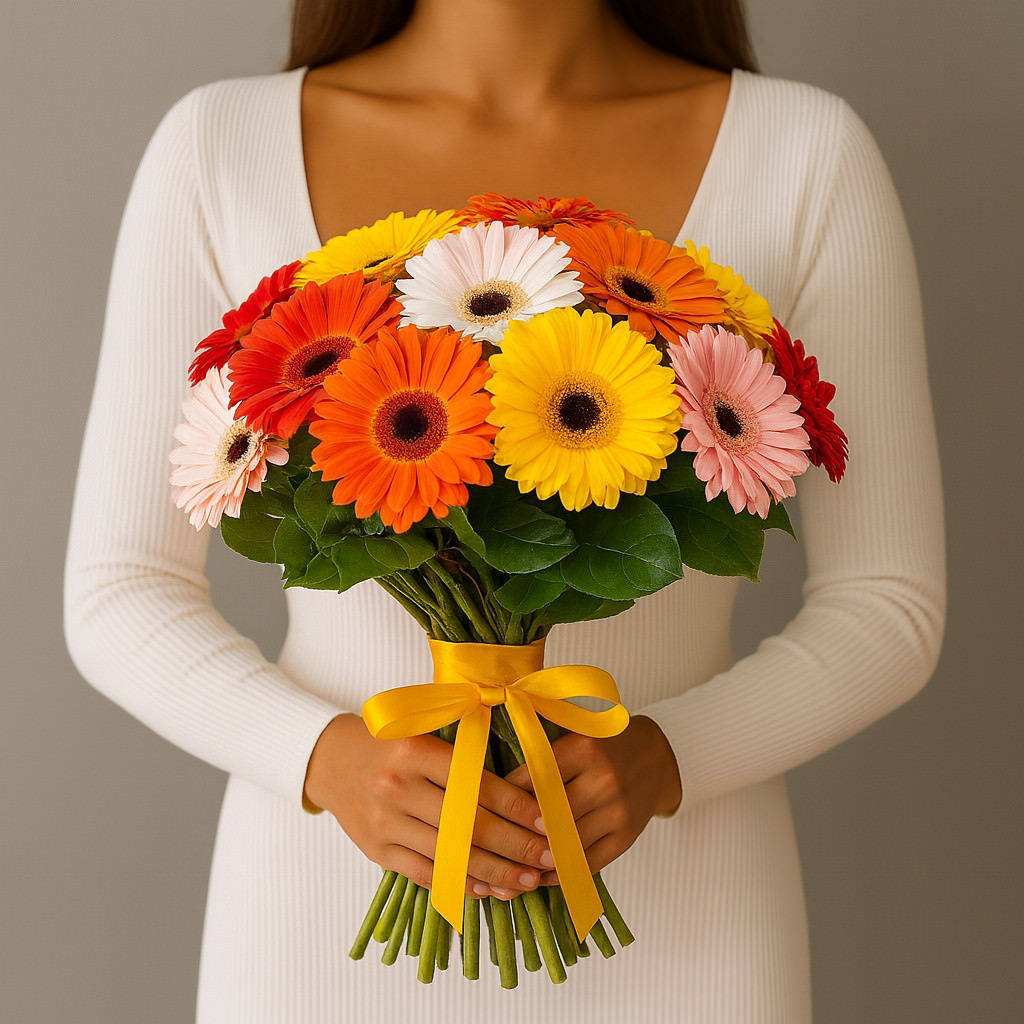 Яркая композиция из разноцветных гербер создаёт атмосферу праздника и радости. Каждое соцветие сияет своими оттенками, а насыщенная зелень и жёлтая лента подчёркивают жизнерадостный характер букета.