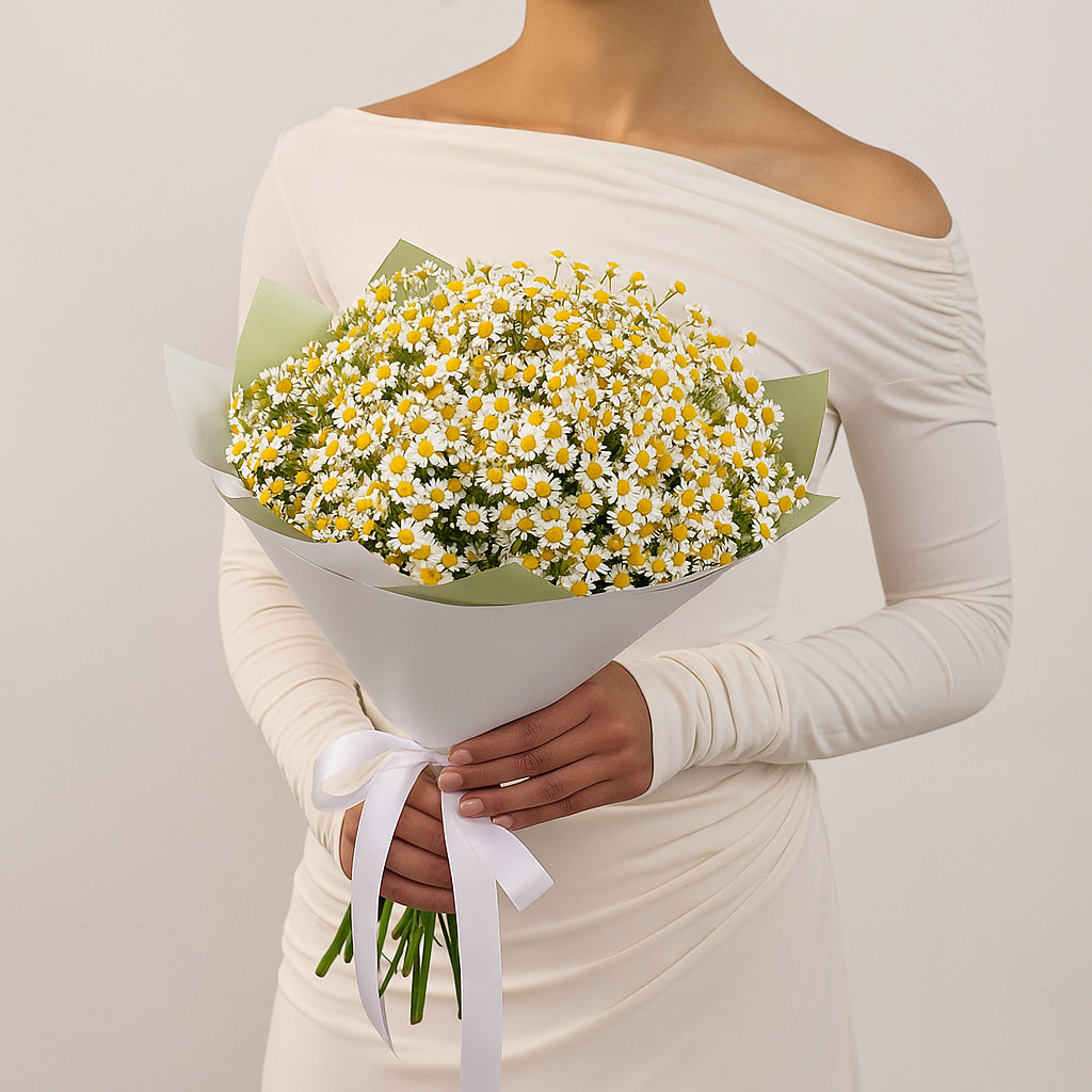 Очаровательный букет из свежих ромашек в нежной упаковке — символ искренности и чистоты. Этот букет подарит лёгкость, радость и напомнит о самых светлых чувствах. Идеальный выбор для душевного подарка близким и любимым.