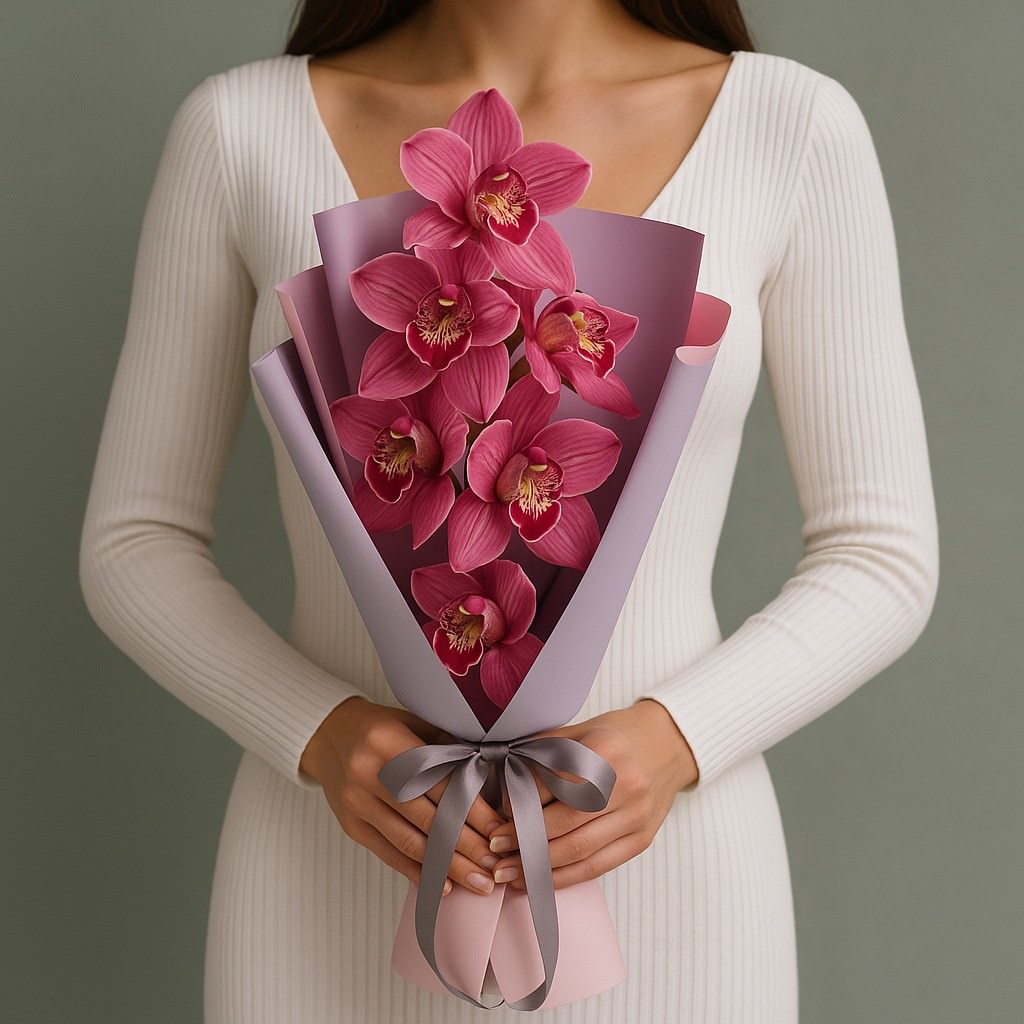 Изящный и утончённый букет из розовых орхидей цимбидиум станет ярким акцентом и символом утончённой красоты. Такой подарок подойдёт как для романтического признания, так и для торжественного события, оставляя после себя атмосферу гармонии и нежности.