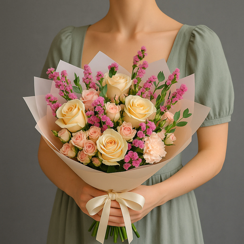 Букет «Великое счастье» — нежный и гармоничный подарок, сочетающий пастельные розы с яркими акцентами статицы. Лёгкий, воздушный и элегантный, он создаёт атмосферу тепла и радости.