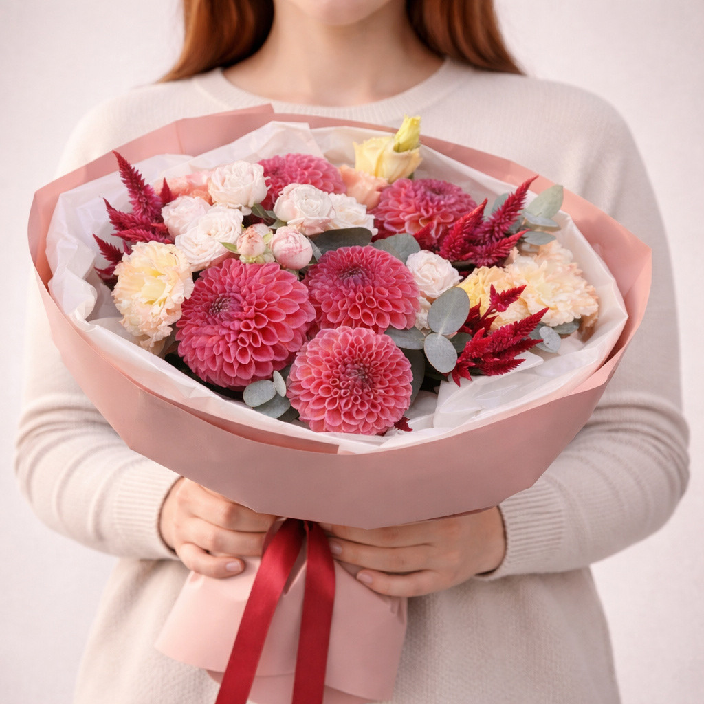 | Состав: | Гвоздики, Георгины, Кустовые розы |