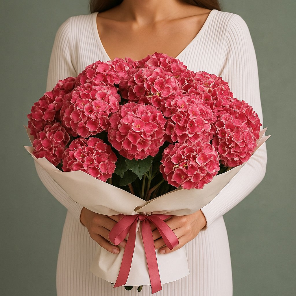 Яркий и насыщенный букет из розовых гортензий станет символом радости и искренних чувств. Пышные шапки цветов в нежной упаковке создают гармонию и элегантность, которая подойдет как для торжественного события, так и для романтического подарка.
