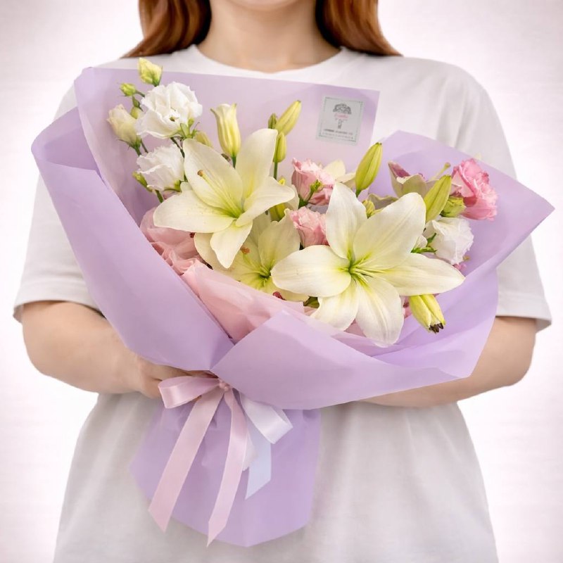 Нежная и утончённая композиция, в которой воздушные лилии сочетаются с мягкими пастельными акцентами.