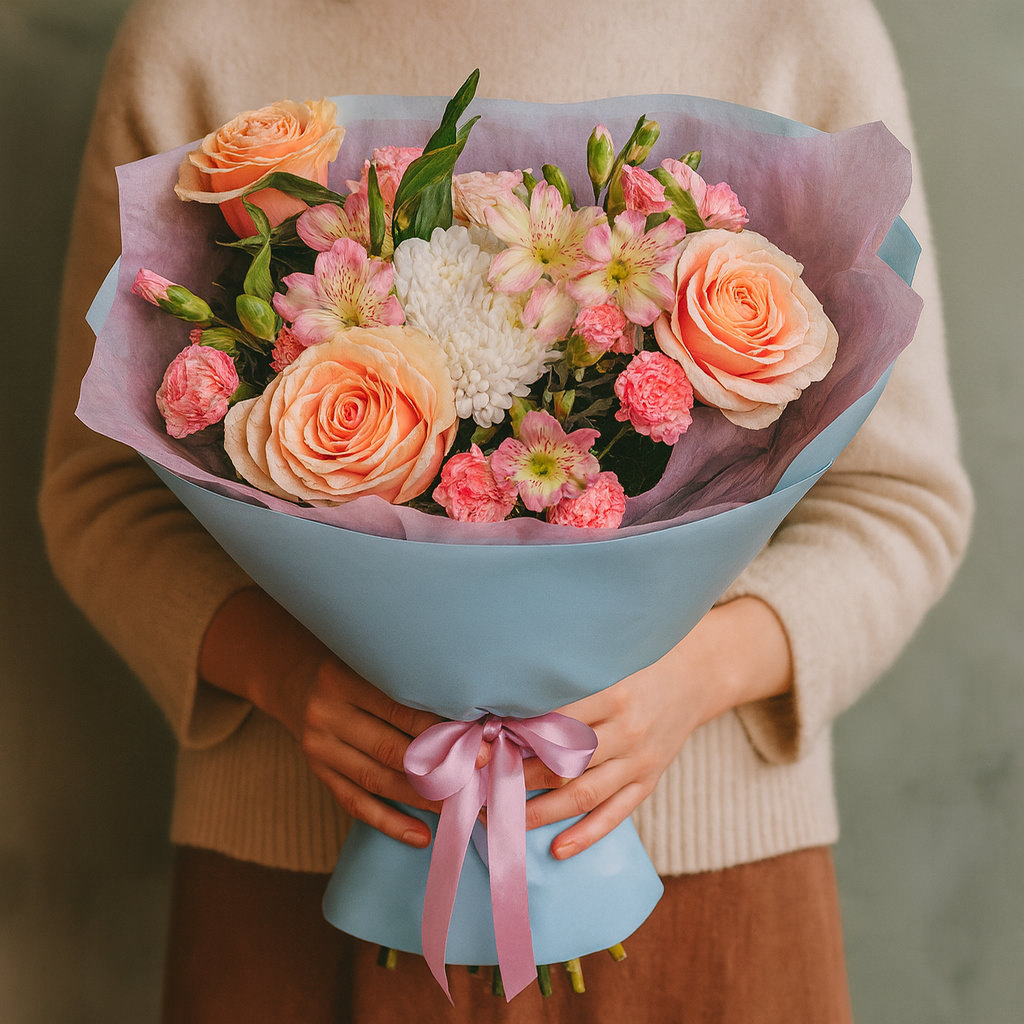 Изысканный букет, наполненный нежностью и очарованием. Сочетание пастельных роз, ярких акцентов альстромерии и свежести гвоздики создаёт гармонию красок и эмоций. Такой букет станет идеальным подарком для самых трогательных моментов и сохранит атмосферу радости и красоты.