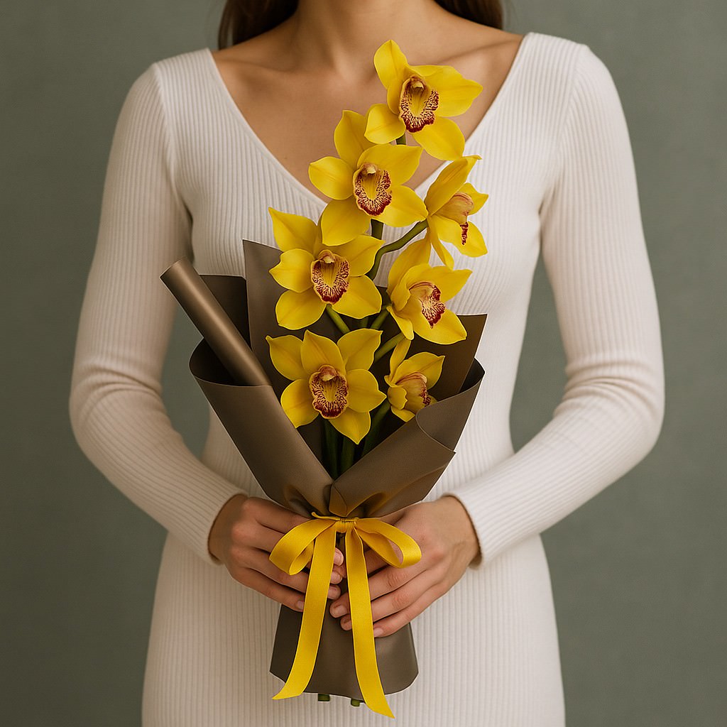 элегантный букет, который излучает тепло и утончённость. Яркие жёлтые орхидеи цимбидиум с изысканным рисунком в центре лепестков создают ощущение праздничности и особого повода. Такой букет подчеркнёт стиль и станет роскошным акцентом для любого торжества.