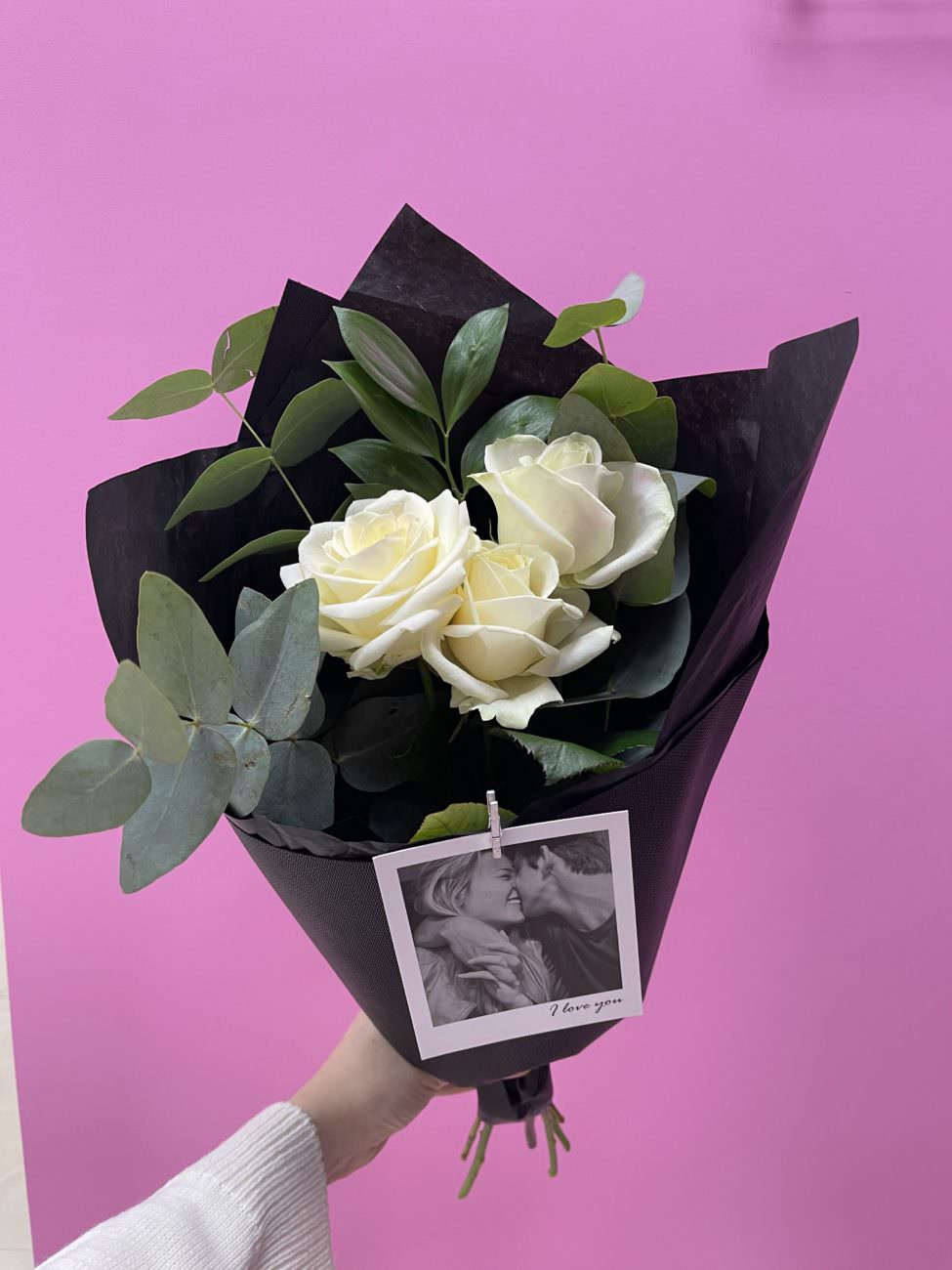 Перед отправкой мы фотографируем готовый букет и отправляем фото клиенту. Это подтверждает соответствие заказу и позволяет убедиться в качестве композиции