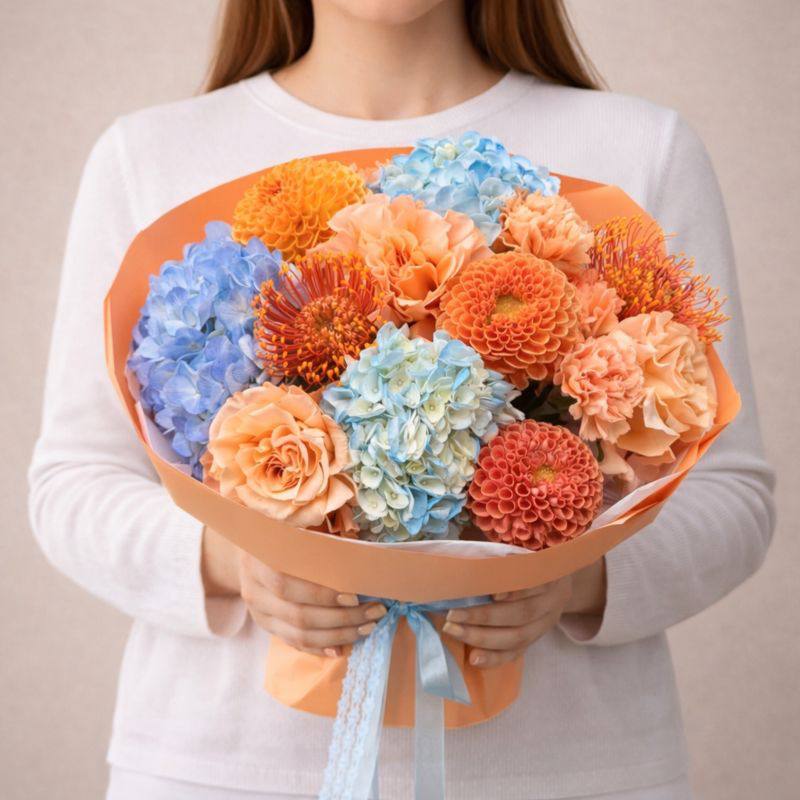 Букет «Тёплый бриз» — это яркая цветочная композиция, в которой сочетаются солнечное тепло и нежная свежесть. Голубые гортензии создают ощущение лёгкого морского ветра, персиковые розы добавляют мягкости и романтики, а оранжевые георгины и экзотический леукоспермум наполняют букет энергией и характером. Такой букет выглядит современно, необычно и очень выразительно — он словно кусочек лета, собранный в цветах.