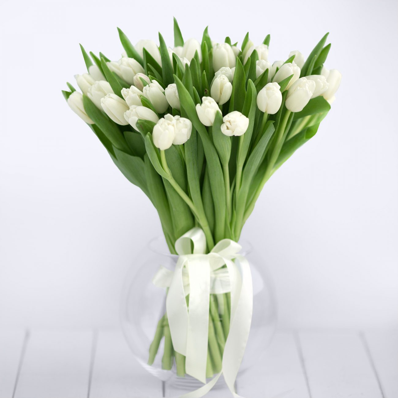 Букет белых тюльпанов под ленту — 51 штук