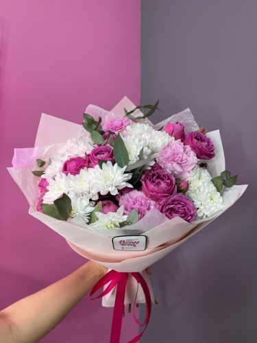Такому необыкновенному букету в белоснежно-розовых тонах будет рада любая женщина. Если Вы не знаете, какие цветы любит та, которую Вы хотите обрадовать, будьте уверены — такая композиция точно придется ей по вкусу.