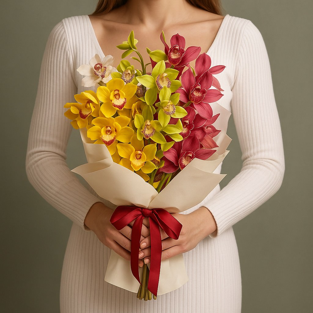 Элегантный букет из веток орхидей Cymbidium в ярких оттенках — жёлтом, розовом, зелёном и белом. Этот цветочный ансамбль символизирует гармонию, роскошь и радость, создавая впечатляющий акцент в любом событии. Такой букет станет изысканным подарком для выражения благодарности, любви или искреннего восхищения.