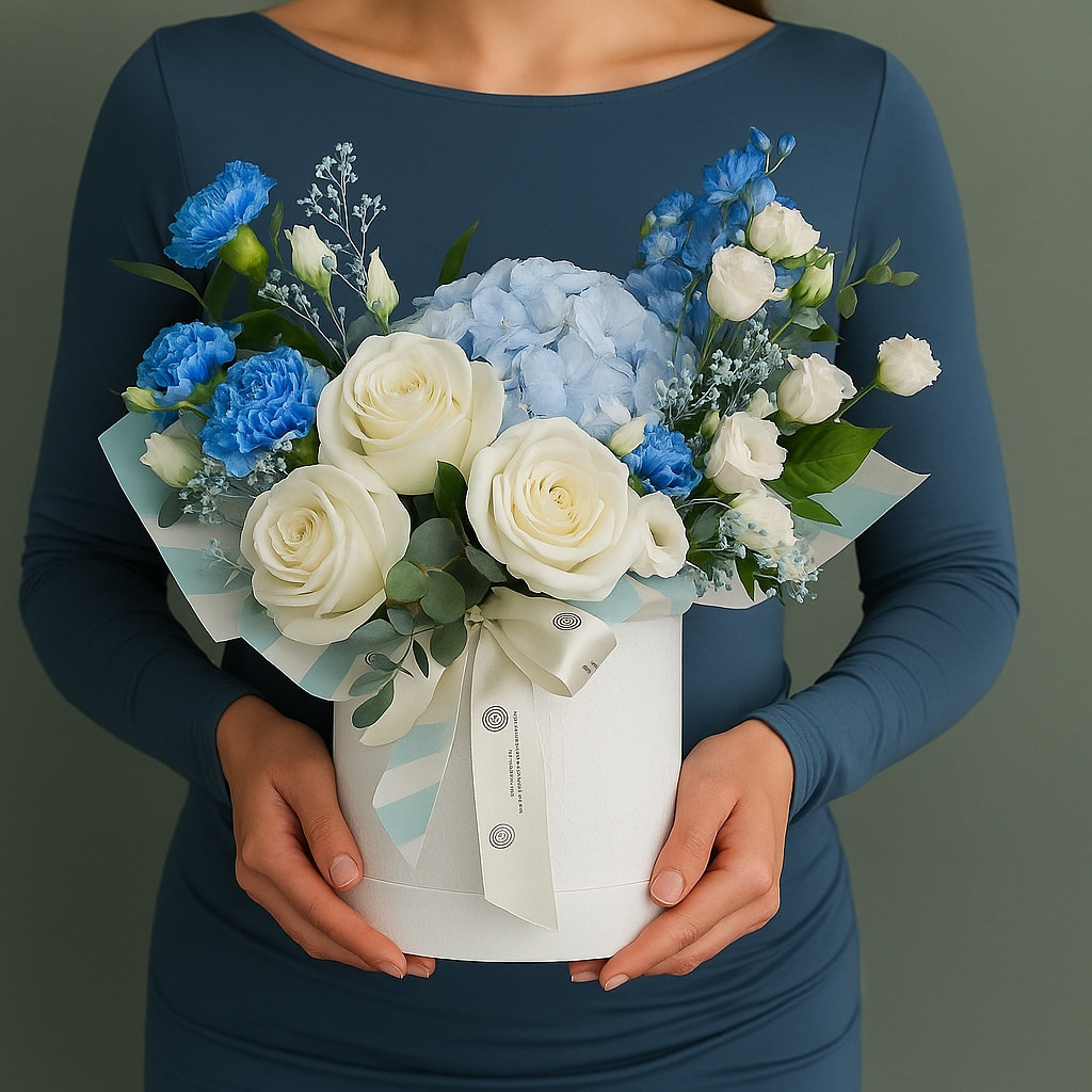 Изысканная композиция из белых роз и нежной голубой гортензии подчеркнёт стиль и вкус дарителя. Такой букет станет украшением торжества и романтическим подарком.