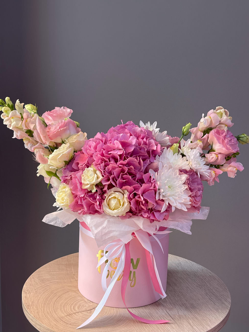 Нежную композицию из гортензии, эустомы и кустовой розы можно подарить сестре, маме или любимой девушке. Цветочная гармония в нежно-розовых тонах покажет ваш вкус и внимательность к близким сердцу женщинам. Не ищите повода, чтобы порадовать их!
