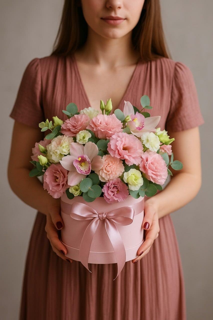 Пудрово-розовые орхидеи, нежный и лаймовый лизиантус и матовые гвоздики собраны в шляпную коробку Ø 15 см с атласной лентой. Градиент «сладкой ваты» дарит мечтательную лёгкость и держит свежесть 7 дней.