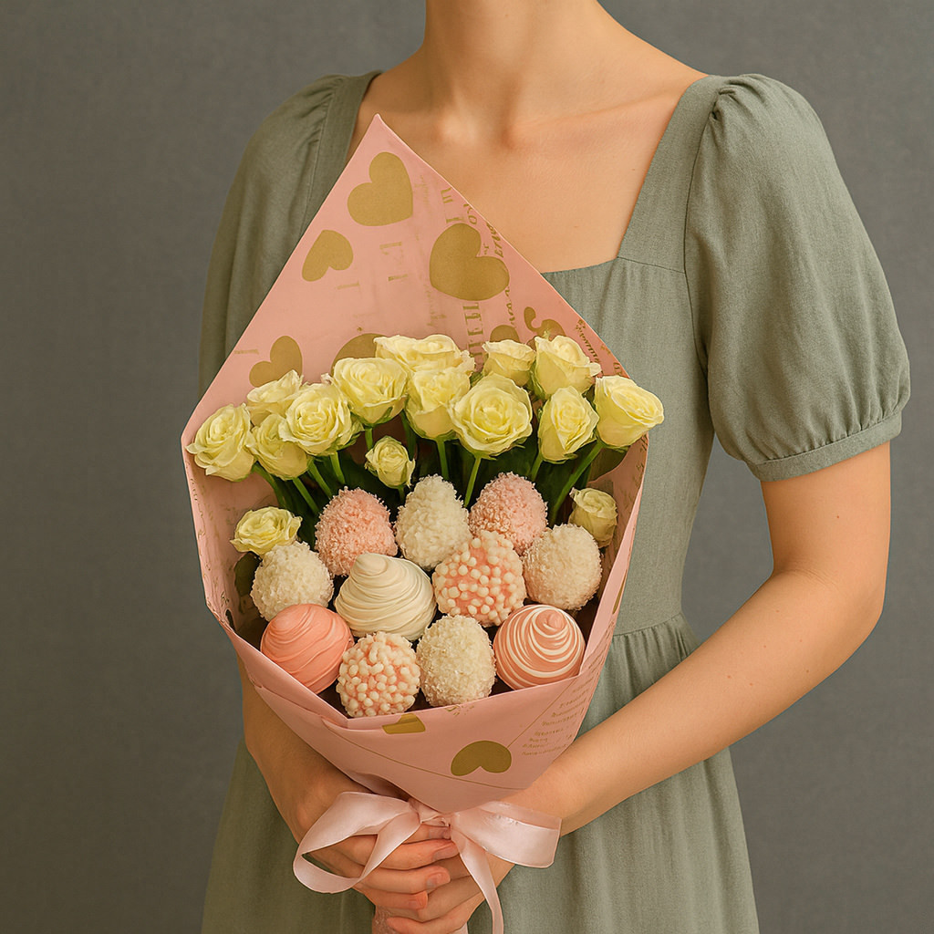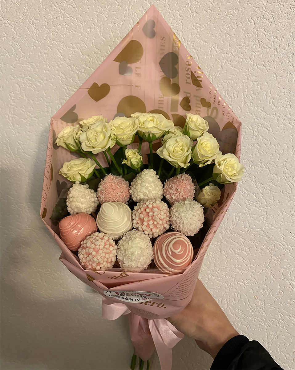 Клубничный букет «Триумф»- малый - букет, который оформлен с особым вниманием к деталям, что придает ему неповторимый шарм