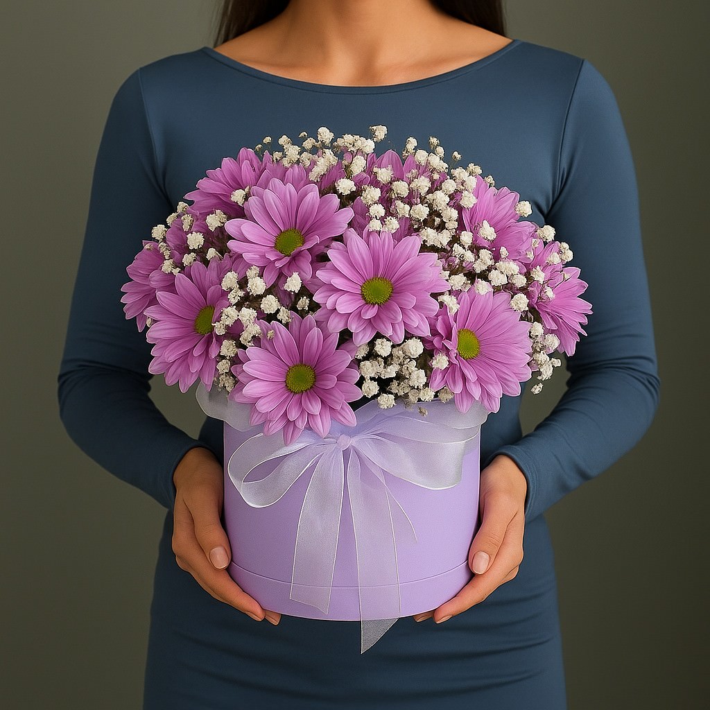 Очаровательная композиция из сиреневых хризантем и гипсофилы в нежной коробке. Дарит лёгкость, романтику и вдохновение.