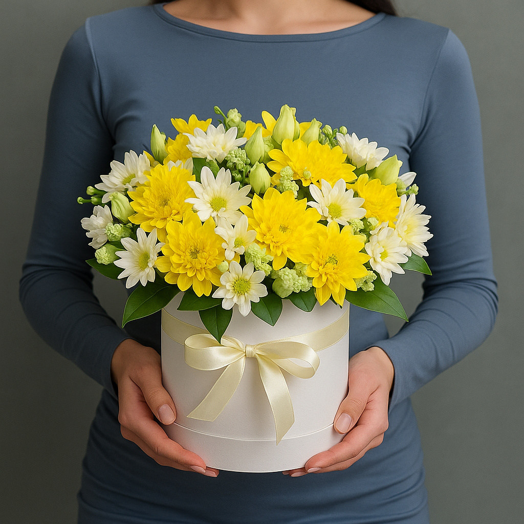 Яркая композиция из жёлтых и белых хризантем дарит тепло и хорошее настроение. Такой букет станет прекрасным подарком для любого повода и наполнит день светом.