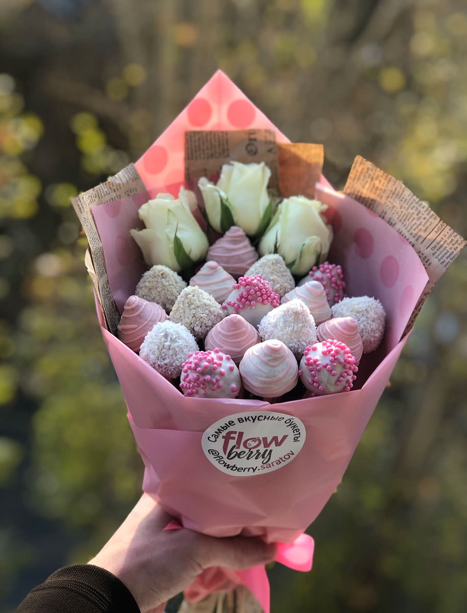 Клубничный букет «Туфелька золушки» - букет, который обретает завершенный вид благодаря стилю оформления и элегантной упаковке